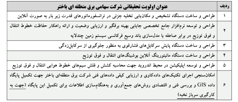 «اعلام اولویتهای پژوهشی شرکت برق منطقهای باختر در سال ۱۴۰۴»
